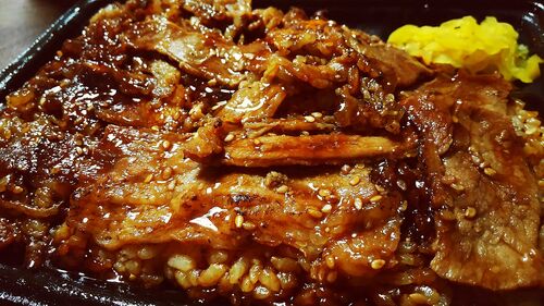 今日のファミマはカルビな気分~。 ってことで、特製ダレの炙り焼牛カルビ重! ご飯一面に牛カルビが乗ったビジュアルに負けてつい買ってしまいました。(^^; ごはん大盛300gの存在感も男飯っぽくて良し! オープン・ザ・ふた~(^0^)/