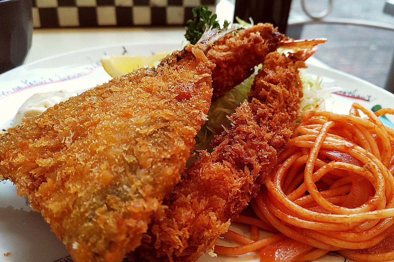 エビフライ×2、アジフライ、ナポリタン、千切りキャベツ、パセリ、レモン、タルタルソース付き。