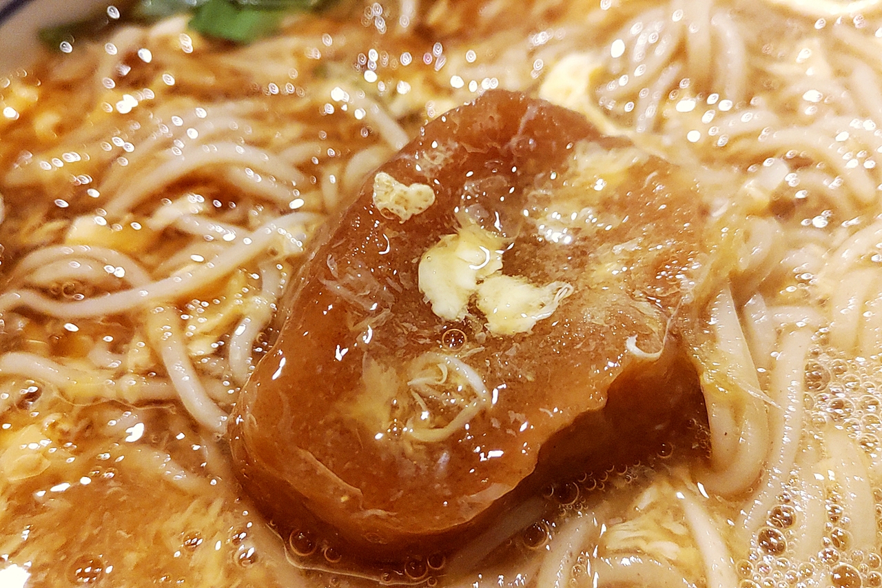 かき玉そばは、玉子、三つ葉、蒲鉾、麩入りの餡かけそばです。