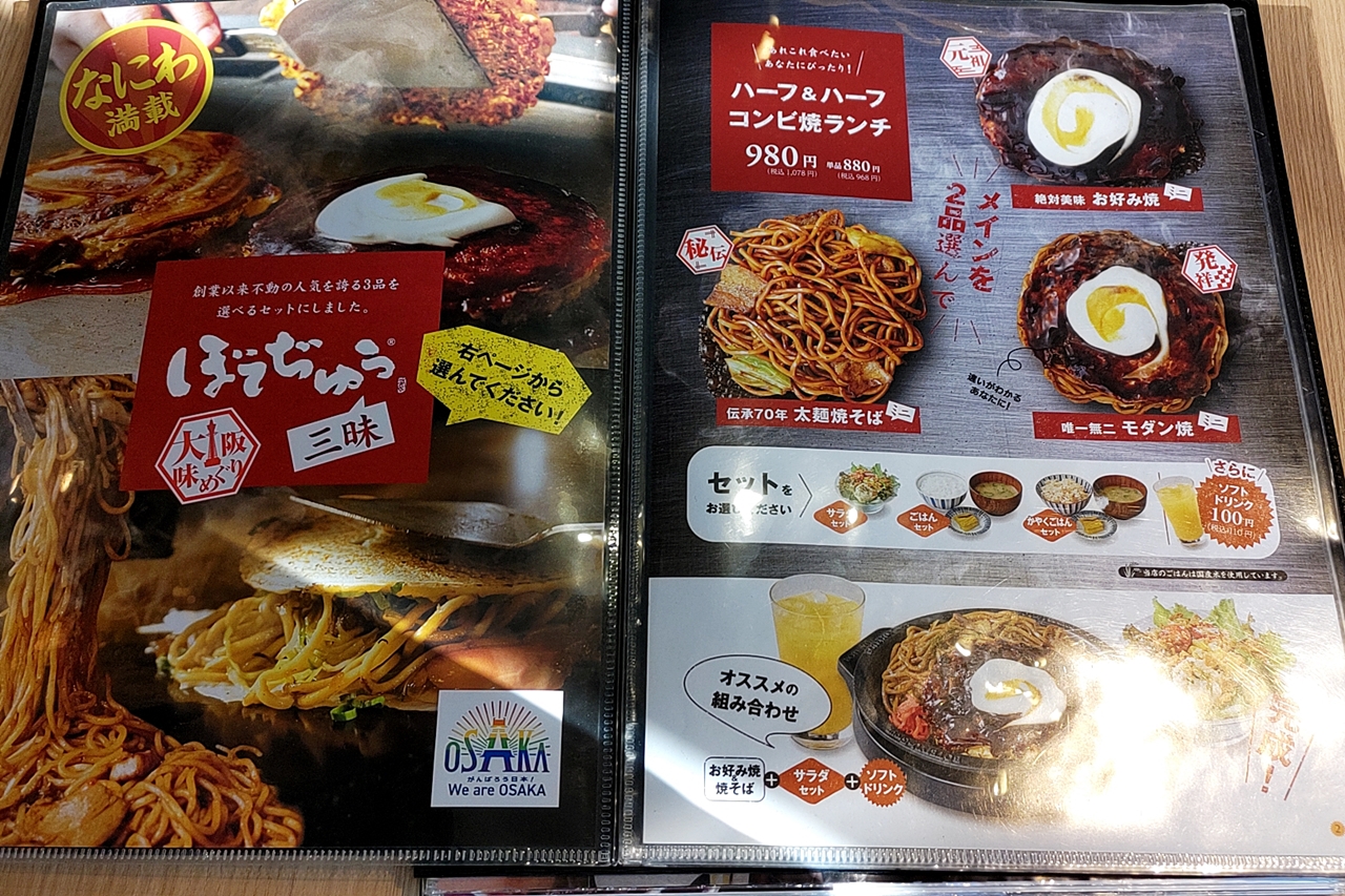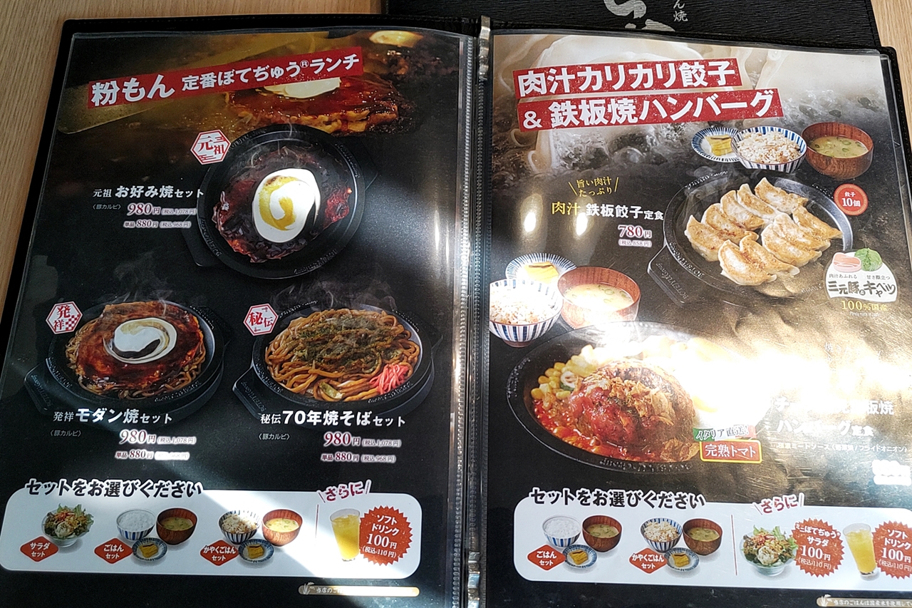 「絶対美味お好み焼(ミニ)」「伝承70年太麺焼そば(ミニ)」「唯一無二モダン焼(ミニ)」の中から2品を選べるランチです。