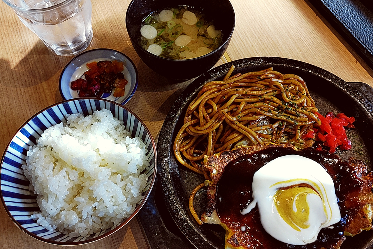 ハーフ&ハーフコンビ焼ランチ(お好み焼・焼そば)(ごはんセット)は1078円(税込)。