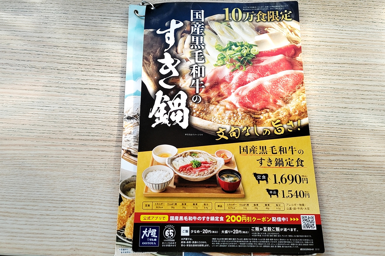 レギュラーメニューの国産牛のすき鍋定食は1490円なので、+200円で黒毛和牛にグレードアップなのです!