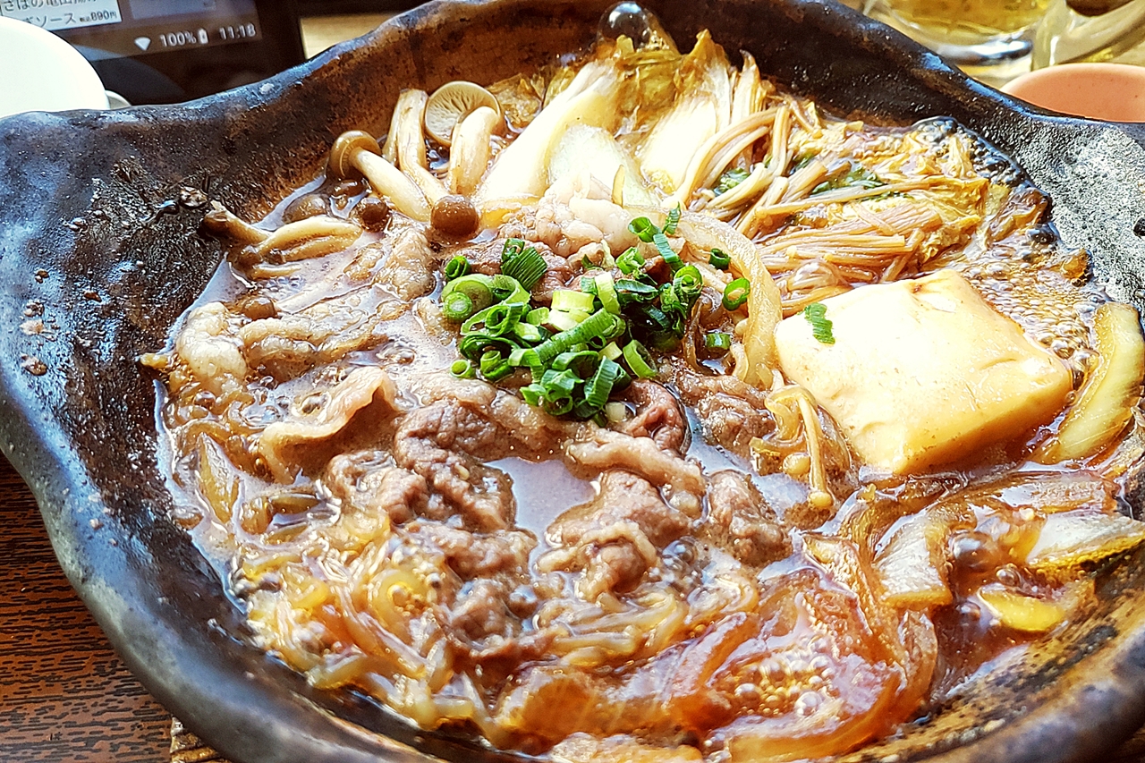 国産黒毛和牛、玉ねぎ、豆腐、しめじ、えのき、糸こんにゃく、等々のすき鍋です。