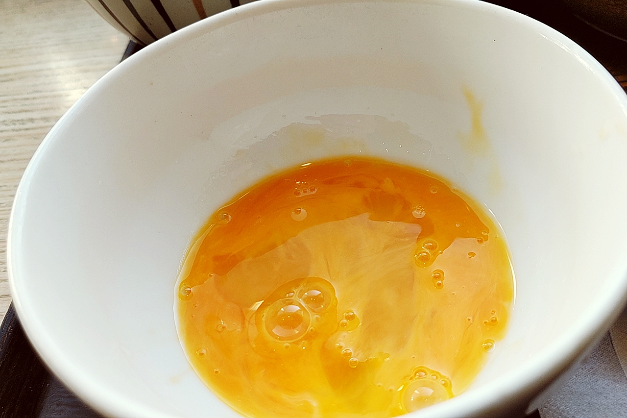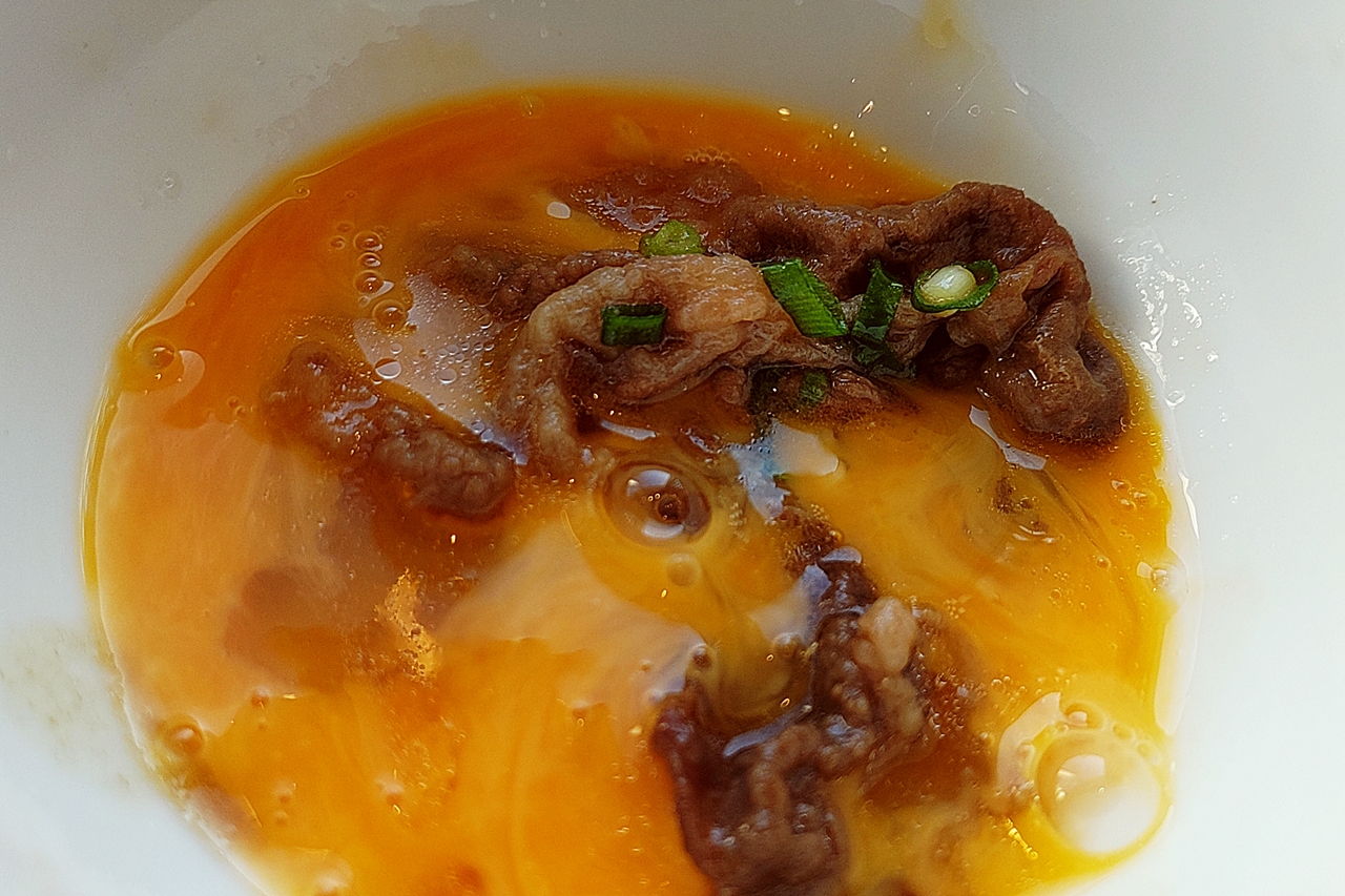 肉を生卵に浸けて食べるジャパニーズスタイルでいただきます。
