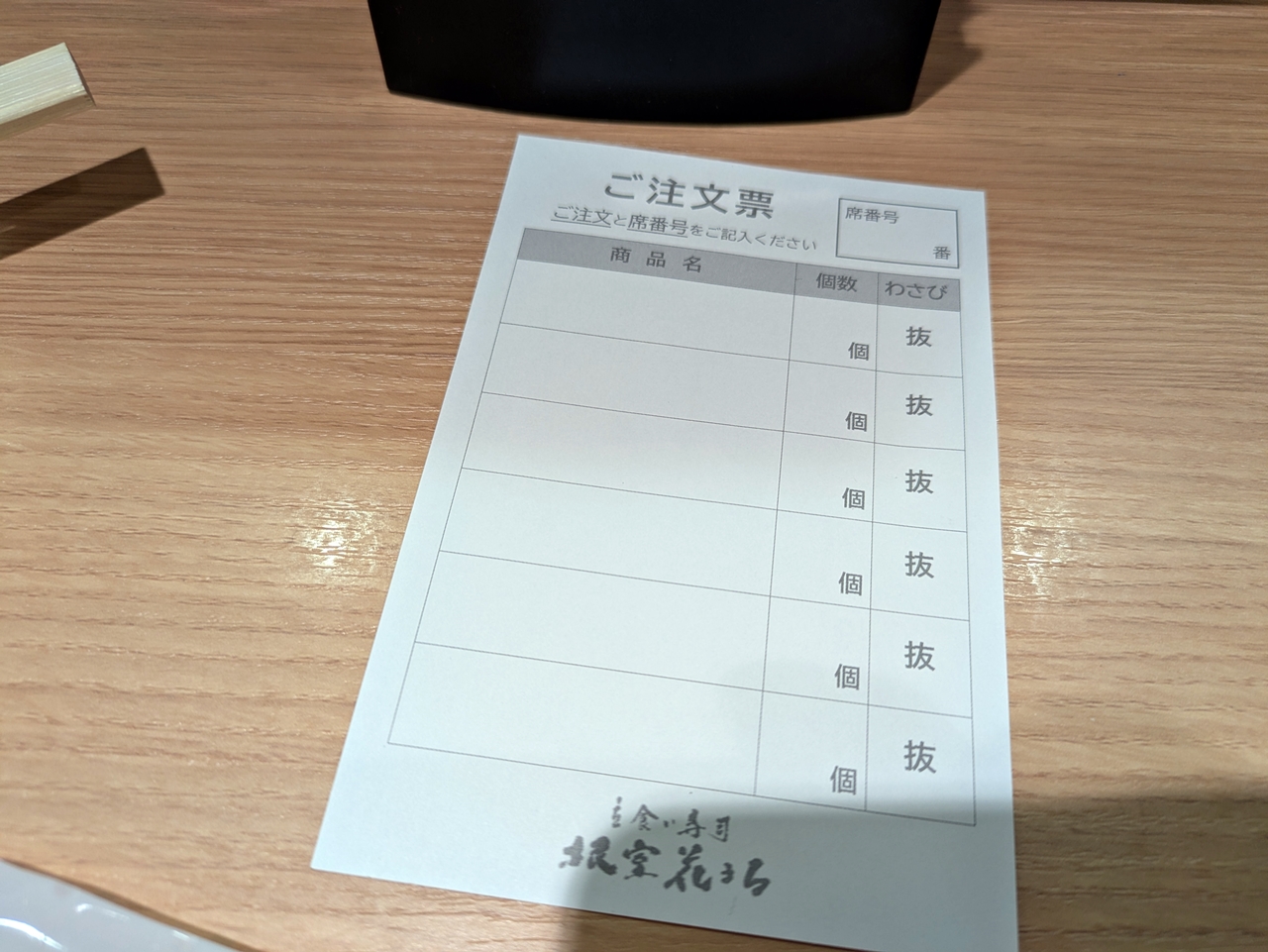 注文は注文票に記入して、カウンター前の板前さんに渡すスタイル。