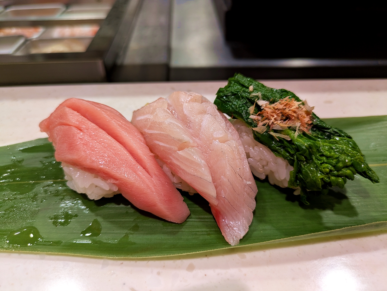 本鮪中とろ380円(税込)、寒ぶり280円(税込)、菜の花の握り220円(税込)