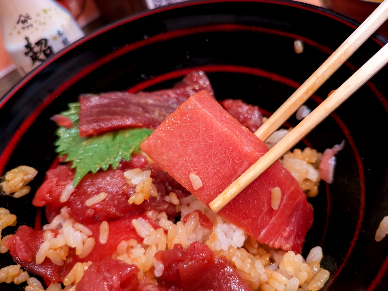 中落ち、赤身、中トロ、大トロのまぐろ丼。