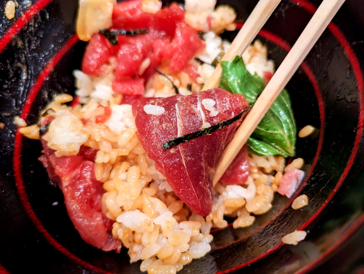 ちなみに、食券を店員さんに渡して席に着こうとすると、待つこともなくスグに又こい丼赤が提供されました。